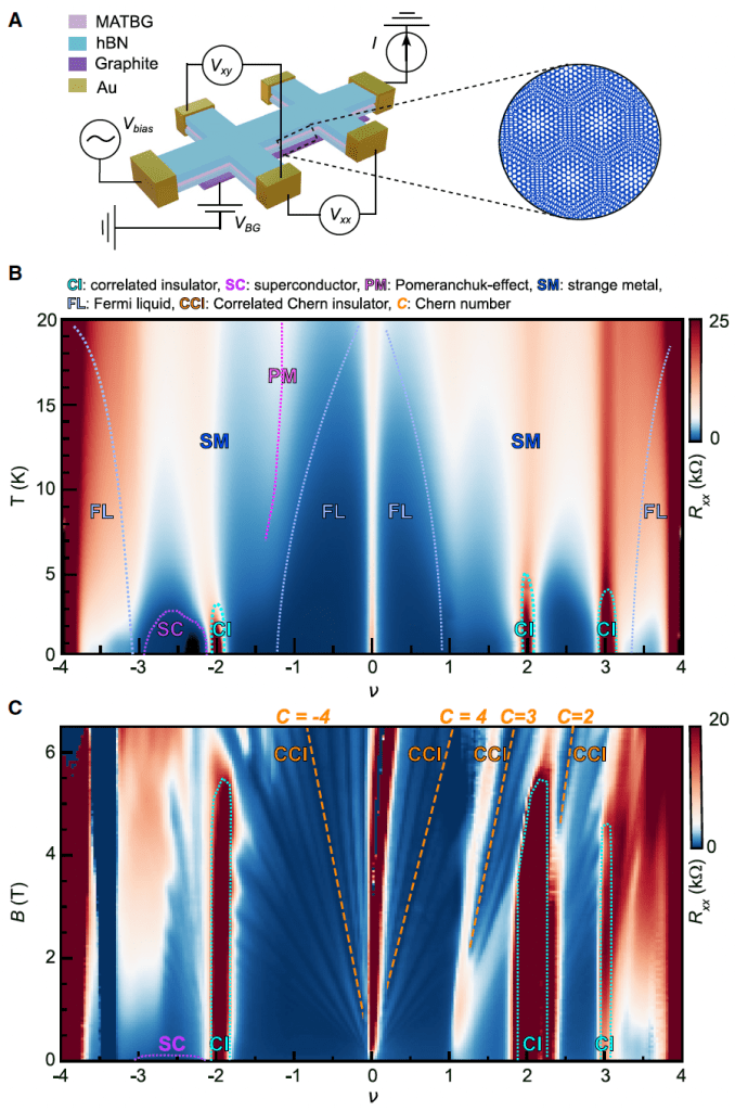Twisting two sheets of 2D materials is an entirely new tuning knob that brings new emergent states that are not seen in the native state of the material. On the right is an example of a magic angle twisted bilayer graphene (MATBG) sample which is two layers of graphene with ~1.1 deg of twist angle between them. This causes 1. Moire periodic potential pattern and 2. flat band near the Fermi level to emerge which hosts various correlated phenomena such as superconductivity, correlated insulator and magnetism. We are able to fabricate high quality twistronics devices using advanced van der Waals assembly techniques such as cut-and-stack and edge-clamping techniques. Read more about it here.